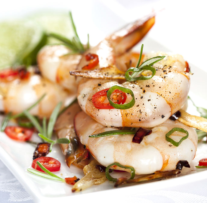 chargrilled broccoli & lemon red tiger prawns seabream shellfish squid